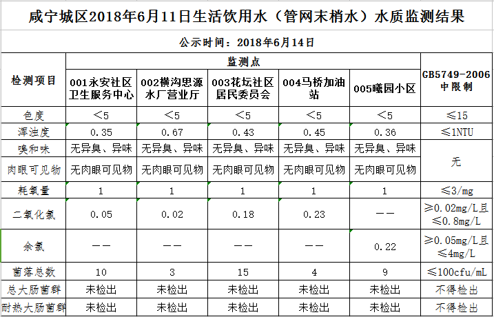 2018年6月14日咸宁城区生活饮用水监测结果公示