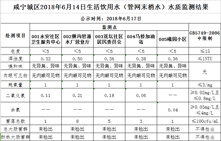 2018年6月18日咸宁城区生活饮用水监测结果公示