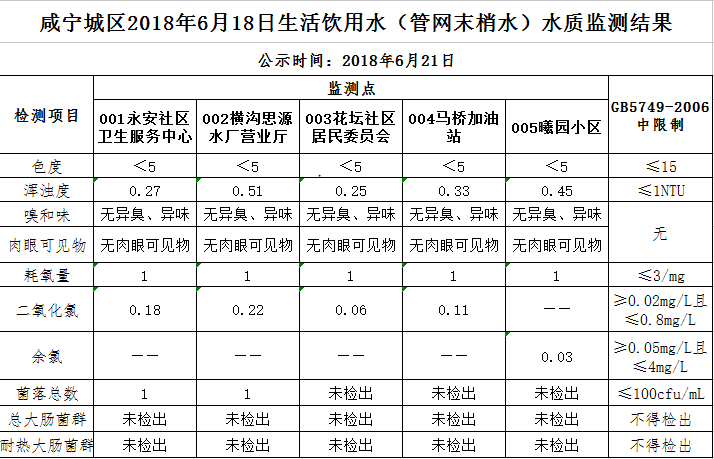 2018年6月21日咸宁城区生活饮用水监测结果公示