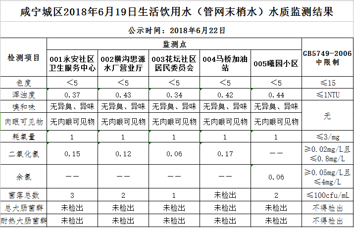 2018年6月22日咸宁城区生活饮用水监测结果公示
