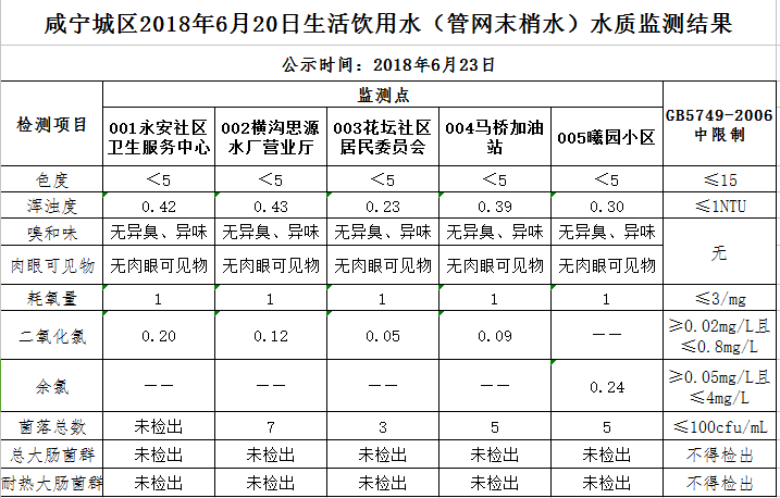 2018年6月23日咸宁城区生活饮用水监测结果公示