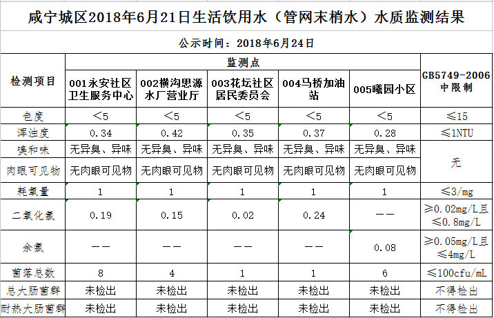 2018年6月23日咸宁城区生活饮用水监测结果公示