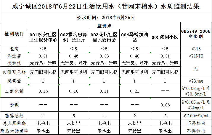 2018年6月25日咸宁城区生活饮用水监测结果公示