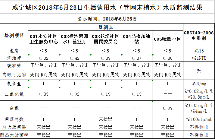 2018年6月26日咸宁城区生活饮用水监测结果公示