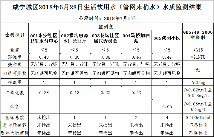 2018年6月30日咸宁城区生活饮用水监测结果公示