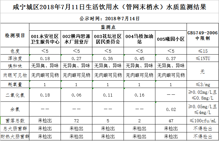 2018年7月14日咸宁城区生活饮用水监测结果公示