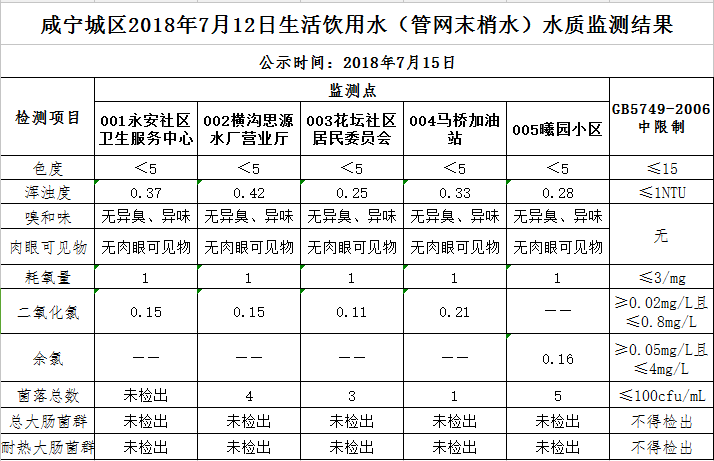 2018年7月15日咸宁城区生活饮用水监测结果公示