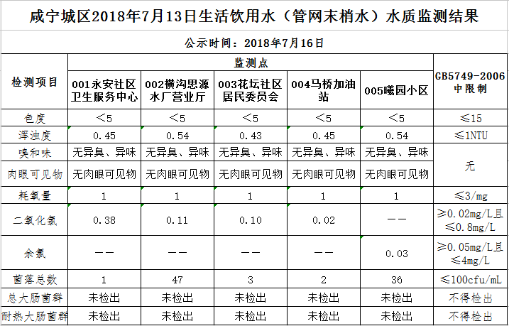2018年7月17日咸宁城区生活饮用水监测结果公示