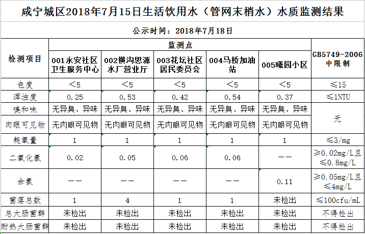 2018年7月18日咸宁城区生活饮用水监测结果公示