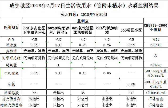 2018年7月20日咸宁城区生活饮用水监测结果公示