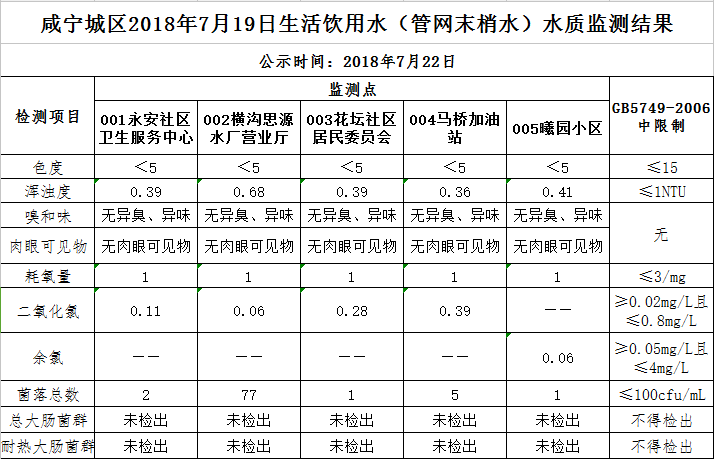 2018年7月22日咸宁城区生活饮用水监测结果公示