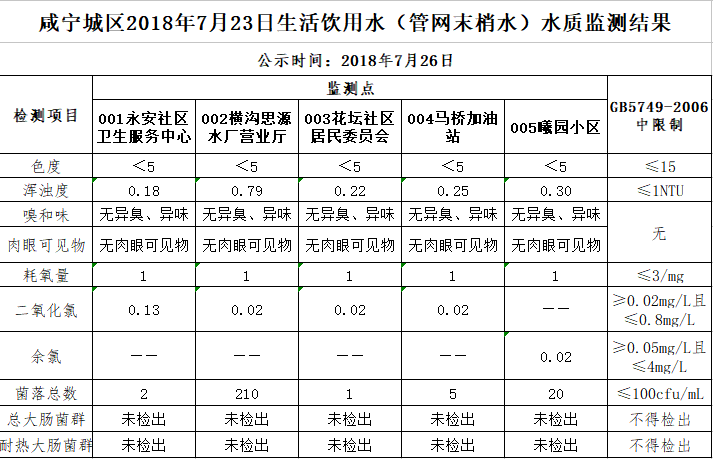 2018年7月26日咸宁城区生活饮用水监测结果公示