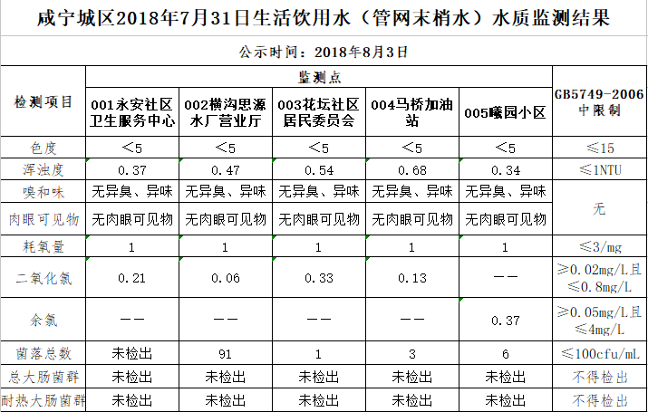 2018年8月3日咸宁城区生活饮用水监测结果公示