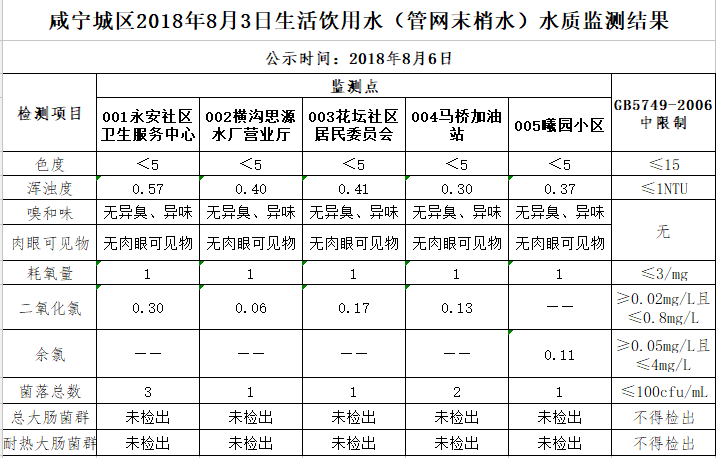 2018年8月6日咸宁城区生活饮用水监测结果公示