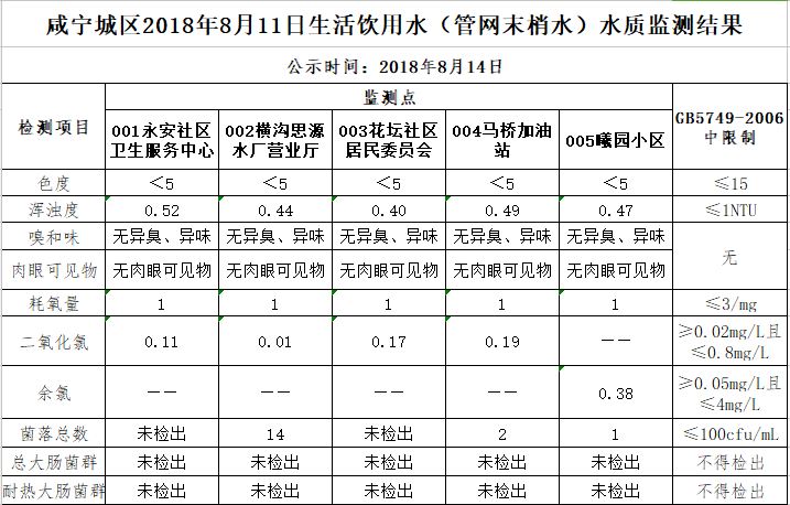 2018年8月14日咸宁城区生活饮用水监测结果公示
