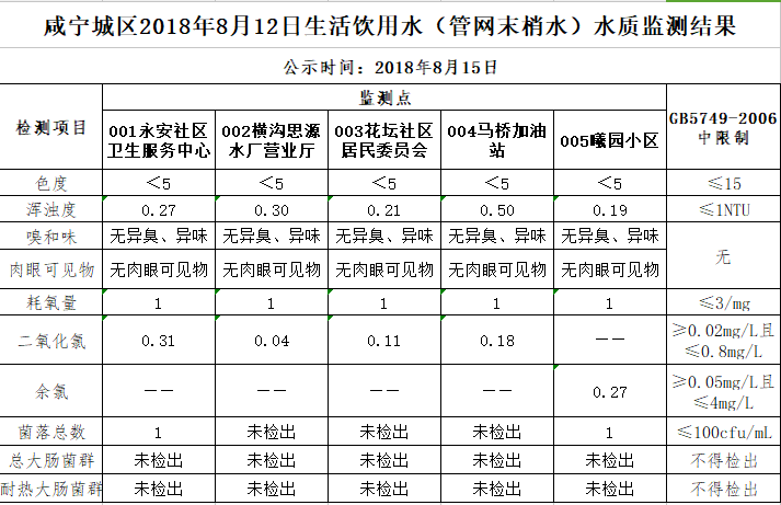 2018年8月15日咸宁城区生活饮用水监测结果公示