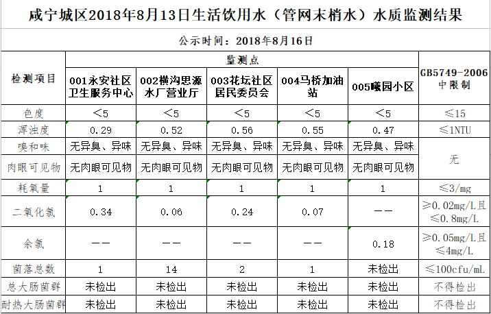 2018年8月16日咸宁城区生活饮用水监测结果公示