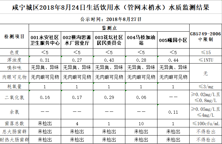 2018年8月27日咸宁城区生活饮用水监测结果公示