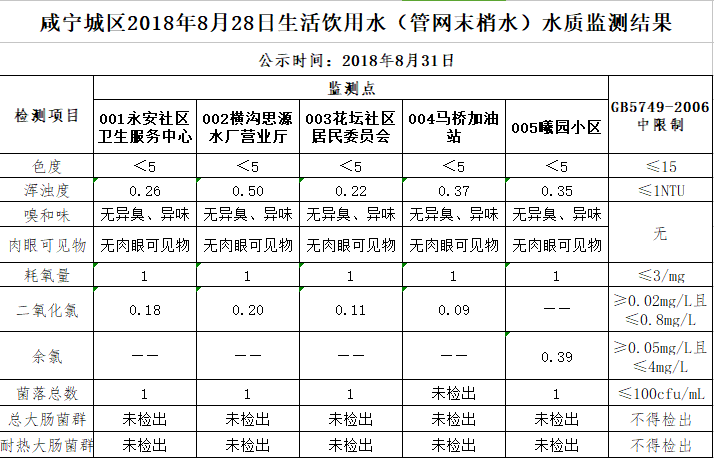 2018年8月31日咸宁城区生活饮用水监测结果公示