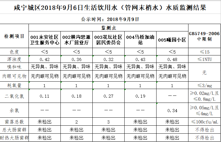 2018年9月9日咸宁城区生活饮用水监测结果公示