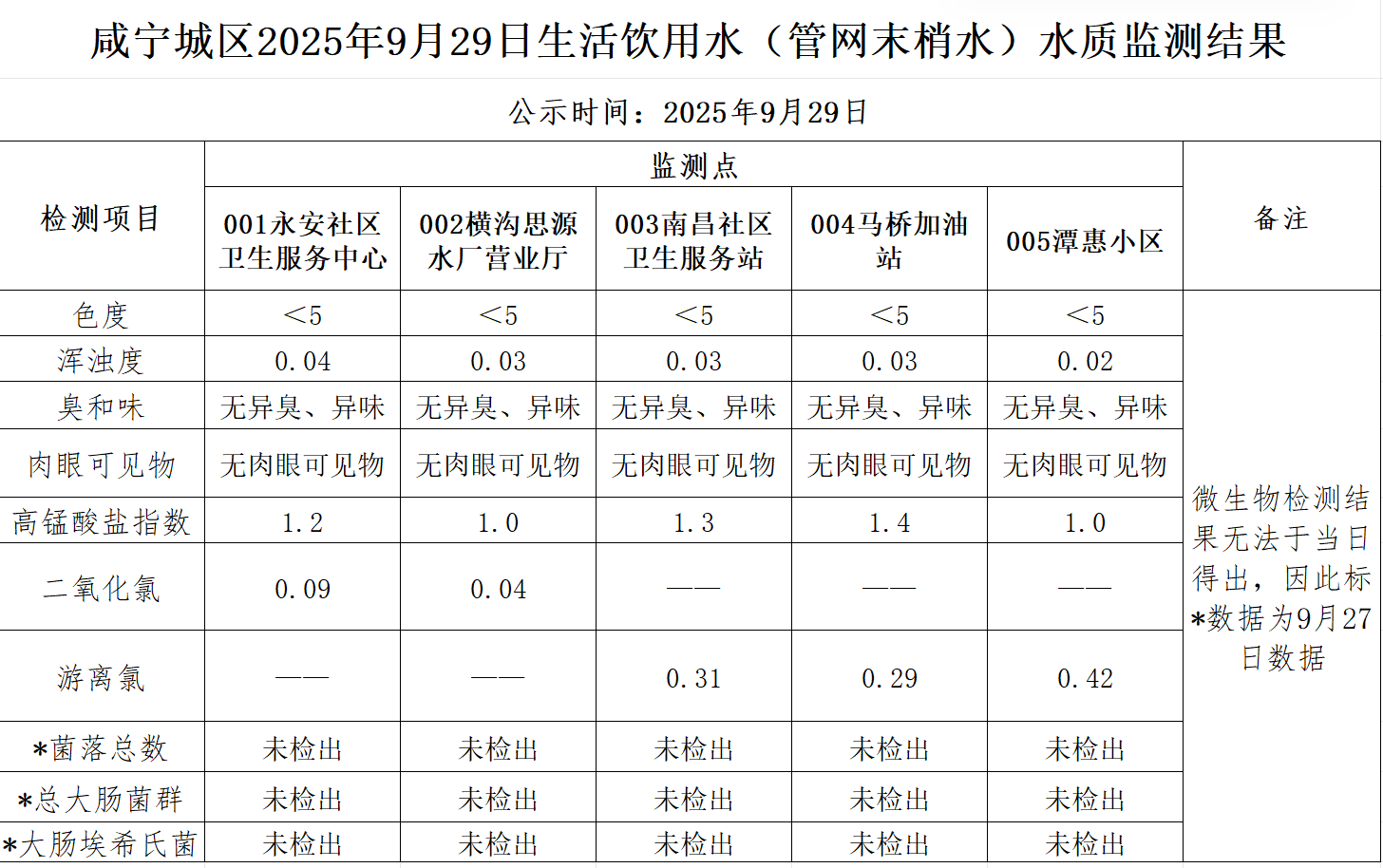 2025年9月29日咸宁城区生活饮用水监测结果公示