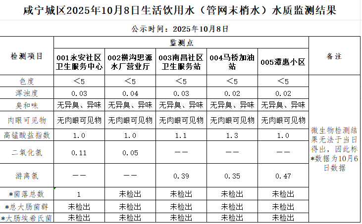 名       称: 2025年10月8日咸宁城区生活饮用水监测结果公示 发布日期: 2025年10月09日