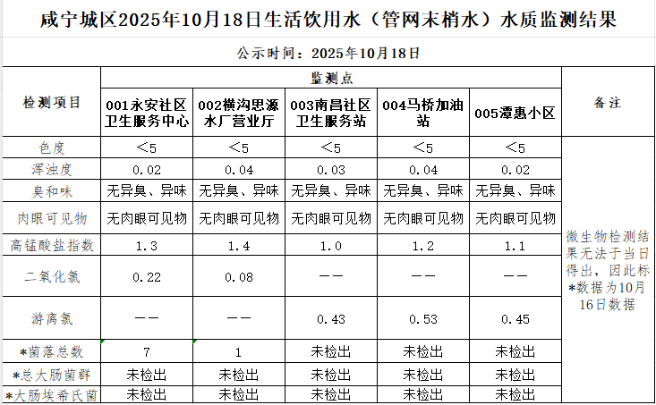 2025年10月18日咸宁城区生活饮用水监测结果公示