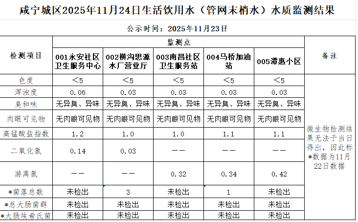 2025年11月24日咸宁城区生活饮用水监测结果公示