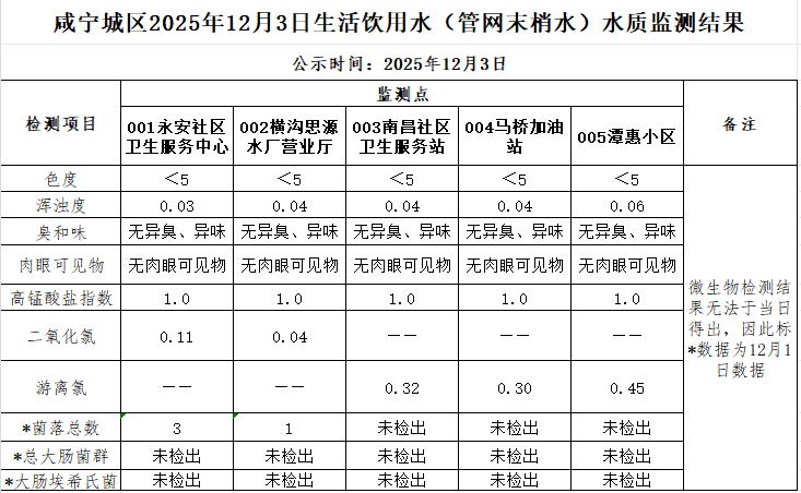 名       称: 2025年12月3日咸宁城区生活饮用水监测结果公示 发布日期: 2025年12月04日