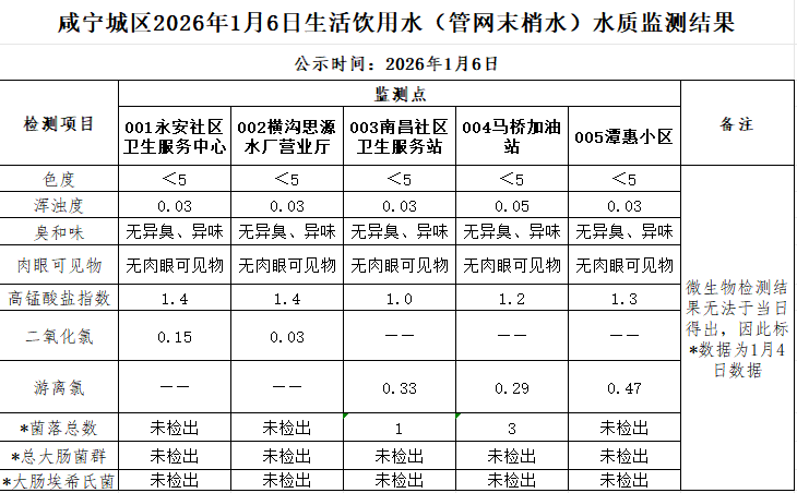 名       称: 2026年1月6日咸宁城区生活饮用水监测结果公示 发布日期: 2026年01月08日