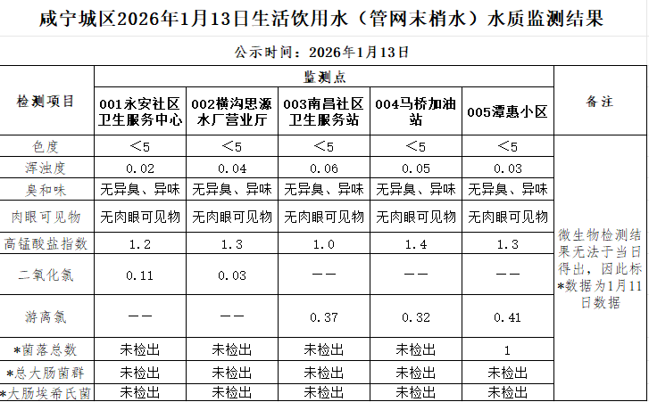 名       称: 2026年1月13日咸宁城区生活饮用水监测结果公示 发布日期: 2026年01月15日