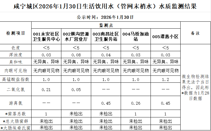 2026年1月30日咸宁城区生活饮用水监测结果公示