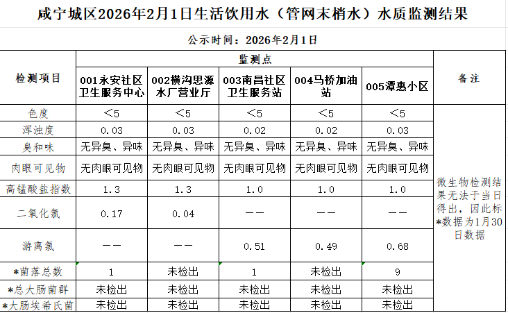 名       称: 2026年2月1日咸宁城区生活饮用水监测结果公示 发布日期: 2026年02月02日
