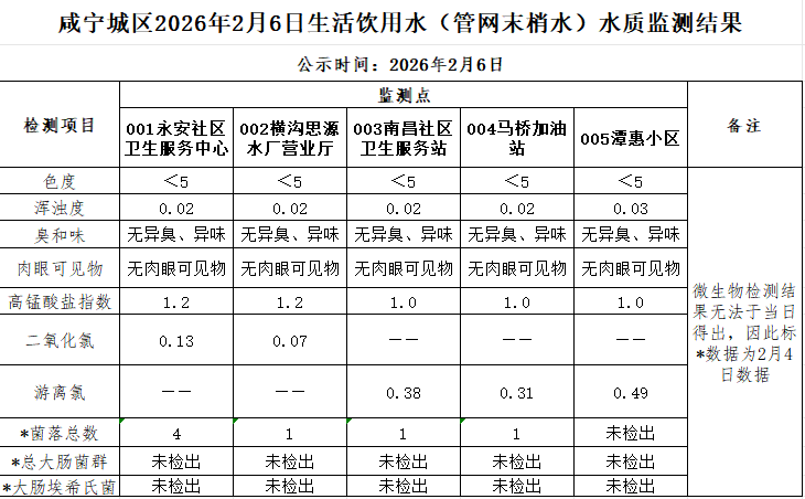 2026年2月6日咸宁城区生活饮用水监测结果公示