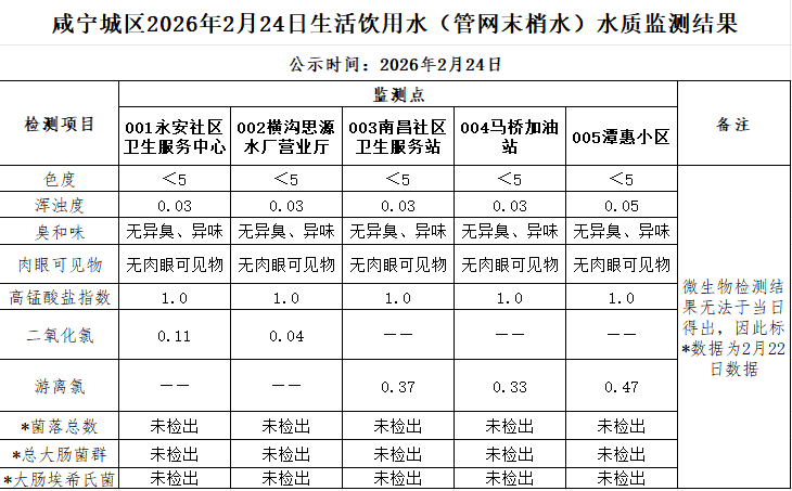 2026年2月24日咸宁城区生活饮用水监测结果公示