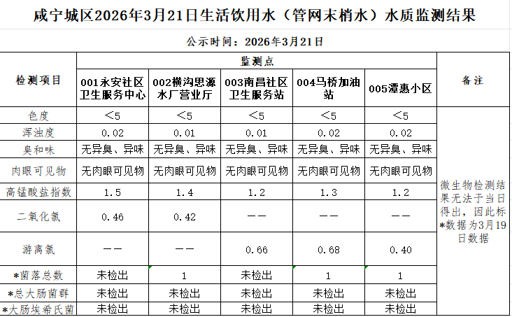 名       称: 2026年3月21日咸宁城区生活饮用水监测结果公示 发布日期: 2026年03月23日