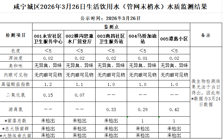 名       称: 2026年3月26日咸宁城区生活饮用水监测结果公示 发布日期: 2026年03月27日