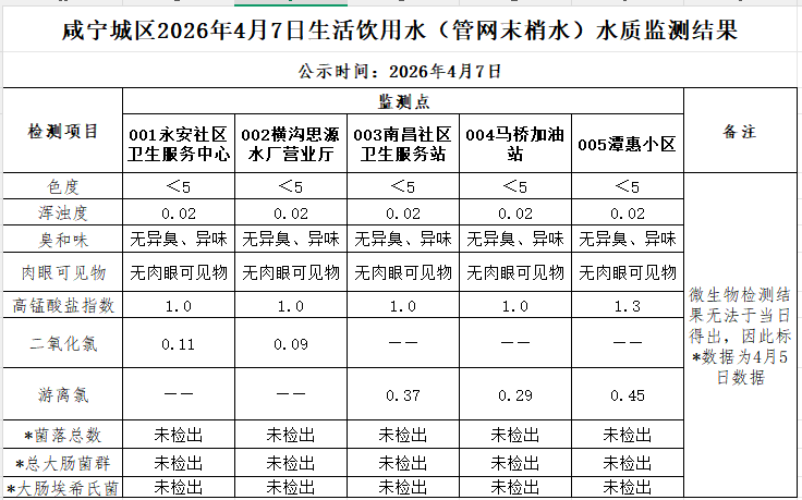 名       称: 2026年4月7日咸宁城区生活饮用水监测结果公示 发布日期: 2026年04月08日